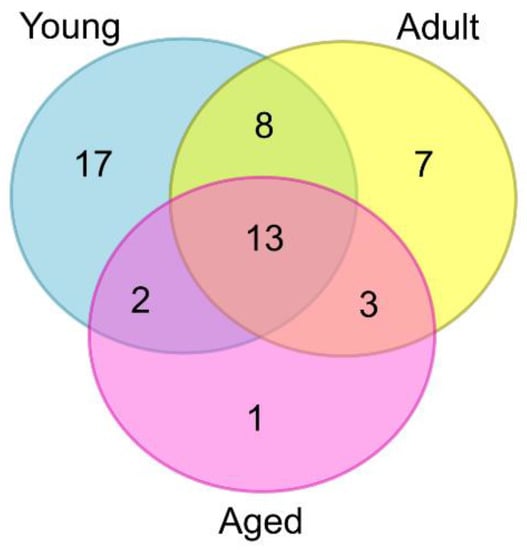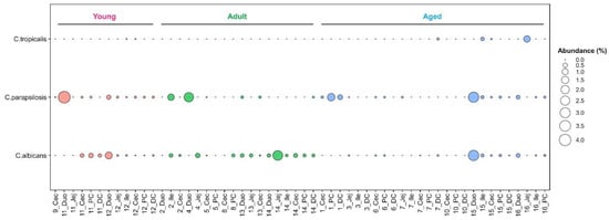 The 134 ASVs were also used to conduct a community analysis of the fungi present in each NHP age group. Specifically, to identify taxa (ASVs) that were specific to or found predominantly in a particular macaque age group, as well as those shared between two or more age groups. The analysis was restricted to those ASVs detected in at least 50% of animals in a particular age group (51/134; Table S5). A Venn diagram was produced from the resulting dataset (Figure 2). In total, seventeen ASVs were found predominantly in the young macaques, seven in the adults, and one in the aged animals. Interestingly, a core set of thirteen ASVs, representing twelve different fungal taxa, were shared between all three age groups (Figure 2). Using type strain ITS1 sequences, ten taxa were resolved to species level and were identified as Candida albicans, C. parapsilosis, Cutaneotrichosporon cutaneum, Debaryomyces hansenii, Filobasidium uniguttulatum, Kazachstania pintolopesii, Pichia fermentans, Rhodotorula mucilaginosa, Vishniacozyma carnescens and Wallemia muriae (Table S5). Amongst these fungi, only C. albicans, C. parapsilosis, K. pintolopesii and P. fermentans are known to grow at 37 °C (or above), and thus represent candidate cynomolgus gut commensals. Overall, two species, namely D. hansenii and K. pintolopesii, were found in every single macaque, irrespective of animal age (Table S5).