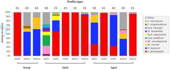 The caecum provided the most samples (13/16 macaques) (Table S2), enabling a detailed comparative characterization of the fungal communities of this section of the macaque GIT. Three distinct profiles (C1–3) were identified based upon the presence and relative abundance of D. hansenii and K. pintolopesii (Figure 5). In the majority (C1; 7/13 macaques), K. pintolopesii was the predominant species. The second commonest (C2; 5/13) was D. hansenii, with a third profile (C3) characterized by the presence of basidiomycetous taxa (e.g., Cystobasidium pallidum and Rh. mucilaginosa). The C3 profile was atypical and restricted to a single adult female (NHP2) (Figure 5). In this animal, this species profile was caecum-specific, and was not replicated in either of the other two intestinal sites analysed, D. hansenii being predominant in the duodenum and K. pintolopesii in the ileum (Figure 3).