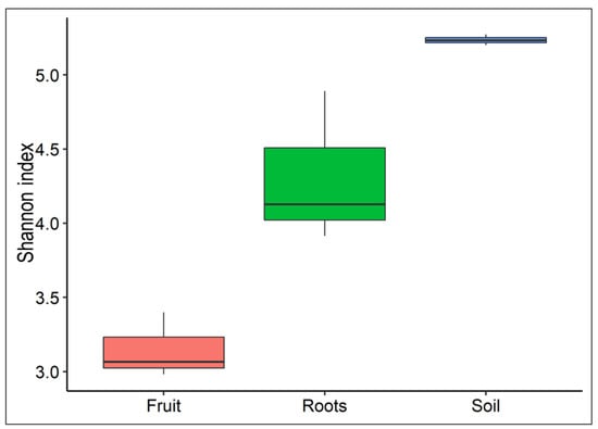 Differences in microbiome diversity of fruit bodies, mycorrhized roots, and rhizosphere. Alpha diversity was based on the Shannon indexes. (Mean values: Fruit: 3.14, Roots: 4.31, and Soil: 5.23).