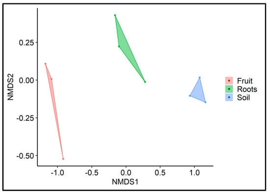 In addition, to determine the diversity variations in the alpha diversity indices, we also evaluated the inter-sample diversity variations (beta diversity) using a non-phylogenetic distance metric (Bray-Curtis) on the NMDS plot. The NMDS ordination showed a distinct microbial community associated with each of the analyzed samples (Figure 2). It is also important to note here that the bacterial communities of root and rhizosphere soil showed closer similarity compared to fruit samples. The peridium maintains some mechanisms that reduce diversity and allow the development of a specific bacterial community.