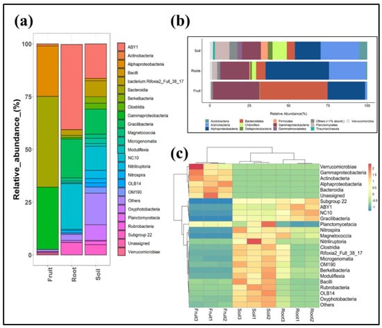 Relative abundance of dominant bacterial groups at the phylum level (a); Relative abundance of dominant bacterial groups at class level (b); Clustering pattern of the bacterial community (at class level) associated with fruit, root, and rhizosphere samples (c).