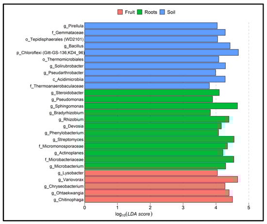 Linear discriminant analysis of taxonomic biomarkers identified in fruit, host plant roots, and rhizosphere samples. The threshold for the LDA score was 3.5.