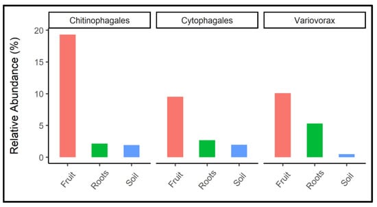 Bacterial groups, such as Pirellula, Gemmataceae, Tepidisphaerales, Bacillus, Chloroflexia, Thermomicrobiales, Solirubrobacter, Pseudarthrobacter, Acidimicrobiia, and Thermoanaerobaculales, were significantly more abundant in the rhizosphere samples. Steroidobacter, Pseudomonas, Sphingomonas, Bradyrhizobium, Rhizobium, Devosia, Phenylobacterium, Streptomyces, Micromonosporaceae, Actinoplanes, Microbacteriaceae, and Microbacterium in root samples, and Lysobacter, Variovorax, Chryseobacterium, Ohtaekwangia, and Chitinophaga in fruit samples. The relative proportion of dominant biomarker bacterial groups that were exclusively associated with fruit samples is shown individually in Figure 5. These included Chitinophagales, Cytophagales, and Varivorax.