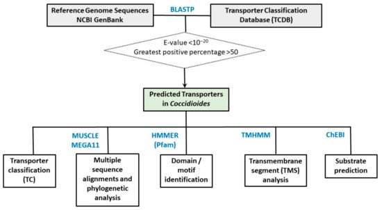 The transporter classification database TCDB, https://www.tcdb.org/ (accessed on 20 July 2021), was used as the knowledge database for the identification and classification of transporters in Coccidioides [27,28]. TCDB includes curated transporter sequences, classification, structural, evolutionary, mechanistic, medical and biotechnological information about transport systems from a variety of organisms. A total of 21,373 amino acid sequences of the transporters collected in the TCDB was downloaded.