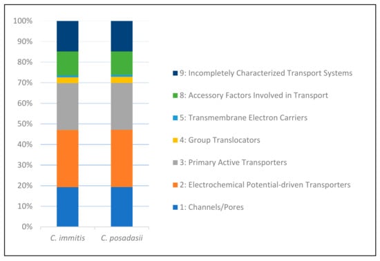 Taking a systems perspective, the TC system also groups various accessory factors that facilitate the transport, but do not directly transport solutes into Class 8. Over 140 predicted homologs fall into Class 8, representing 11% of the total transporter homologs in C. immitis and C. posadasii. The physiological roles of these putative transporters are largely unknown.