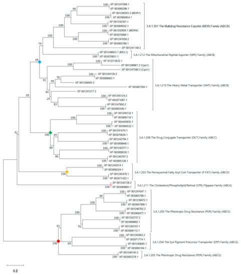 Evolutionary relationships of major ABC transporter families in C. immitis and C. posadasii. The evolutionary history was inferred using the neighbor-joining method [36]. The percentage of replicate trees in which the associated taxa clustered together in the bootstrap test (1000 replicates) are shown next to the branches [39]. The tree is drawn to scale, with branch lengths in the same units as those of the evolutionary distances used to infer the phylogenetic tree. The evolutionary distances were computed using the Poisson correction method [97] and are in the units of the number of amino acid substitutions per site. Evolutionary analyses were conducted in MEGA11 [38]. Accession numbers: XP_0012XXXXX (C. immitis sequences), XP_004445935.1 (C. immitis), and XP_0030XXXXX (C. posadasii sequences). Each colored diamond corresponds to the branching point leading to a specific ABC group.