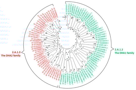 Evolutionary relationships of DHA transporter families in C. immitis and C. posadasii. The sequences in the DHA1 family are marked in green, and the sequences in the DHA2 family are marked in red. The evolutionary history was inferred using the neighbor-joining method [36]. The percentage of replicate trees in which the associated taxa clustered together in the bootstrap test (1000 replicates) are shown next to the branches [39]. The tree is drawn to scale, with branch lengths in the same units as those of the evolutionary distances used to infer the phylogenetic tree. The evolutionary distances were computed using the Poisson correction method [97] and are in the units of the number of amino acid substitutions per site. Evolutionary analyses were conducted in MEGA11 [38]. Accession numbers: XP_0012XXXXX (C. immitis sequences), XP_004445935.1 (C. immitis), and XP_0030XXXXX (C. posadasii sequences).