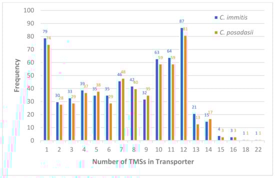 Distribution of transporter topologies in Coccidioides immitis and Coccidioides posadasii genomes. No TMS helices were identified in 658 predicted transporters in C. immitis and 640 predicted transporters in C. posadasii.