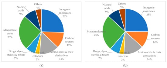 The distribution of substrate types of transporter proteins in Coccidioide genomes. The transporters with no identified substrates were excluded. (a) Distribution of substrate types in C. immitis genome; (b) Distribution of substrate types in C. posadasii genome. The substrates for predicted Coccidioides transporters were predicted based on the Chemical Entities of Biological Interest (ChEBI), an ontology and dictionary focused on small chemical compounds [33].