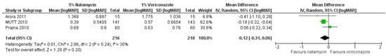 There have been two published meta-analysis studies comparing natamycin to voriconazole, with the primary outcome being best spectacle-corrected visual acuity at three months [5,18]. These included the pilot study by Prajna and colleagues (2010), the study by Arora and colleagues, and MUTT1 [11,12,19]. The Cochrane review found a non-significant trend favouring natamycin (Figure 1) [5], whilst McDonald et al. found evidence for natamycin being superior to voriconazole [18]. The discrepancy between these two results is likely due to differences in the inclusion criteria and analysis strategy; the total number of subjects in the analysis by McDonald was 473, compared to 434 in the Cochrane review. The Cochrane review analysis used a more conservative random-effects model rather than a fixed-effect model, as there were only three studies included. There has been no further published peer-reviewed meta-analysis that includes the more recent study by Sharma et al. (2015), although if this study were also to be included, then the pooled estimate of effect would be clearly in favour of natamycin 5% (standardised mean difference 0.34 logMAR, 95% CI 0.17 to 0.50; I2 = 73.3%, p = 0.011; personal communication from Dr Simon Arunga).