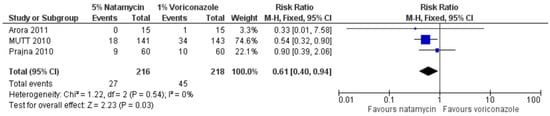 If one considers perforations (or need for TPK) as the outcome measure, there are significantly fewer perforations or TPKs in patients treated with natamycin 5% compared to voriconazole [5,18], as reported by the two meta-analyses (risk ratio favouring natamycin 1.89, 95% CI 1.14 to 3.12; I2 = 0%, p = 0.01; Figure 2) [18].