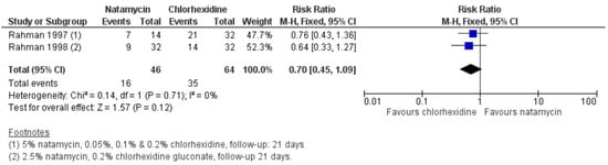 Overall, a Cochrane systematic review of treatments for fungal keratitis found a non-significant trend favouring chlorhexidine 0.2% over natamycin 5% in “curing” by 21-days (RR = 0.70, 95%CI 0.45–1.09) when the data from these two trials was combined; see Figure 3 [5].