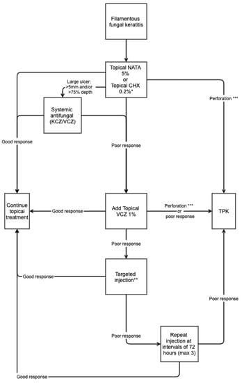 Suggested treatment protocol for filamentous fungal keratitis. * Topical Natamycin 5% is first-line treatment but chlorhexidine 0.2% can be given if natamycin is unavailable. ** Targeted injection refers to either intrastromal/intracameral voriconazole/amphotericin B. *** Perforation includes descemetocele, impending, and frank corneal perforations. Adapted from the TST Protocol [76].