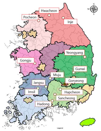 Bat capture sites in this study. Altogether, 241 bats were captured in 13 cities belonging to six provinces of South Korea from August to November 2021. The city in which bats with Pd were captured is marked with a red filled circle.