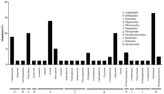 Classification of cultured fungi at the class and genus levels. Seventy-nine fungal colonies were isolated from the two media. Microascaceae was the most dominant family, followed by Apioporaceae and Pleosporaceae.