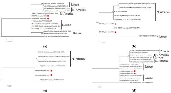 Maximum likelihood tree based on the DNA sequences of four loci. Comparative analysis of Pseudogymnoascus destructans (Pd) was based on separate analyses of four loci: ITS (a), LSU (b), MCM7 (c), and TEF1-a (d). The tree was built using MEGA 7.0.26 [16] with the best fit model. Branch support values were obtained using 1000 bootstrap replicates.