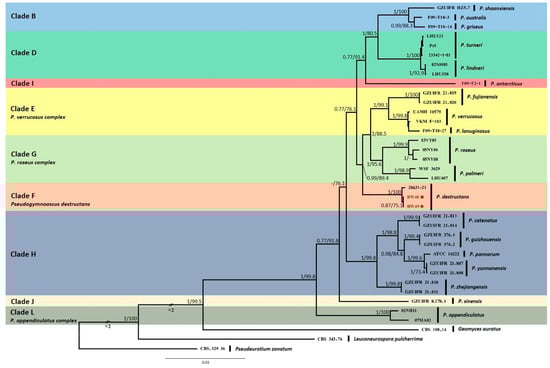 Bayesian inference phylogenetic tree of Pseudogymnoascus genus generated from the concatenated dataset of five loci (ITS, LSU, TEF1, RPB2, and MCM7). Bayesian posterior probabilities (BPPs) and significant maximum likelihood bootstrap (BS) values are indicated by branches. Only clades that received 0.75 BPPs and 70% BS simultaneously were considered strongly supported and presented at the branches. Clades were identified using clade nomenclature (A to M), formally defined by Minnis and Lindner [15]. The scale bar indicates 0.03 nucleotide changes per site. Pd is highlighted in red and with a red spot.