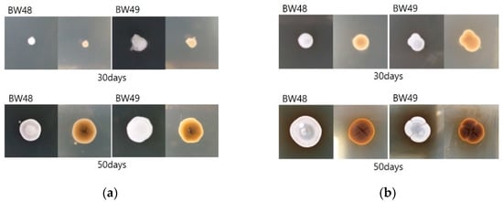 Morphology of isolated Pd according to the time period for growth. Cultured fungal colonies changed from a white and cottony appearance to gray, and fungal colonies cultured on SDA medium secreted a brown pigment: (a) DPYA Media; (b) SDA Media.