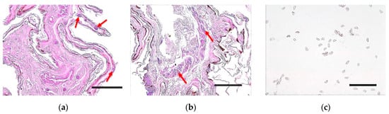 PAS and H&E staining did not reveal the characteristic cup-like lesions caused by WNS in paraffin sections of the tissue observed under a microscope. However, fungal spores surrounded by acellular material were identified in the epidermis and dermis of the bat wings (Figure 6a,b). Microscopy of the isolated Pd revealed distinct curved fungal conidia (Figure 6c).