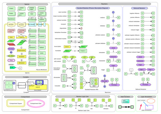 - Funahashi, A.; Morohashi, M.; Matsuoka, Y.; Jouraku, A.; Kitano, H. CellDesigner: A graphical biological network editor and workbench interfacing simulator. In Introduction to Systems Biology; Humana Press: Totowa, NJ, USA, 2007; pp. 422–434. ISBN 9781588297068. [Google Scholar]