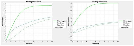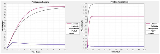 The prediction and behavior by simulation are used to understand the series of events taking place during the fruit development process in mushrooms. The predicted dynamic behavior ascertains the effect of the expression of genes in different environments. Simulation studies are helpful in the interpretation of the fate of various molecular species and metabolites with the degree of importance in the model. In simulation, although it is difficult to estimate the amount or concentration of molecular species/metabolites, an approximation was set up using previous wet laboratory-based studies. Knowing the amount of molecular species in quantitative terms will help us to find links and association amongst species [25,32]. In our model, we have used the range of 0.5 to 2.5 for each molecular species. The values of genes were set at 0.5, proteins were set at 2.0 and mRNA was set at 1.0. The value 2.5 was set for phenotypes and phenotypic responses. In each species, the variation of 0.5 to 1.0 was given and checks the changes in expression in the fungal cell (Figure 3, Figure 4 and Figure 5). Simple molecules were set at 0.5 due to its basal amount. The values for Pleurotolysin and membrane receptors were between 0.0 and 1.0 to study the effect on mycelium aggregation or knot formation. Similarly, the values for hydrophobin and Pleurotus White Collar complex protein were between 0.0 and 2.0 to study the effect on pinhead formation and fruit body devolvement. All the dynamics are provided in Supplementary files.