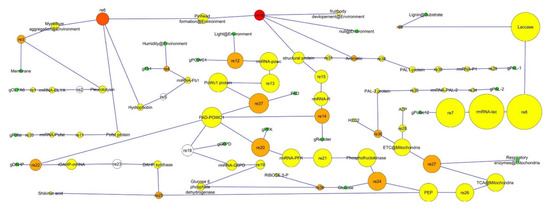 The model analyzed for the network analysis showed the series of events predicted to occur during fruiting, and a total of 89 nodes and 90 edges were developed. The simple topology parameters are number of nodes, number of edges, connected components, clustering coefficient, network diameter, network radius, shortest paths, average neighbors numbers, density, radius, heterogeneity, centralization, self-loops and characteristic path length [28]. The network was developed using a directed network to estimate the average path length. The simple parameters analyzed in the network analysis are presented in Table 1.