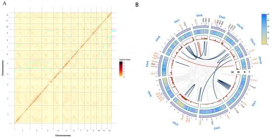 Hi-C interaction heat map and genomic features of the Ganoderma lucidum yw-1-5. (A), Hi-C interaction heat map of Ganoderma lucidum yw-1-5 haploid genome. (B), Global view of the yw-1-5 genomic features. The names marked outside the circle were identified as gene clusters and the cluster names in red represent the terpene clusters. The detailed information of these gene clusters was listed in Table S6. Circle I represents the 12 pseudo-chromosomes of G. lucidum (Mb). Circle II represents gene density on every pseudo-chromosome. Circle III represents repetitive sequence density on each pseudo-chromosome. Circle IV represents large segmental duplications: regions sharing more than 90% sequence similarity over 10 kb were connected by red lines; those over 5 kb were connected by dark blue lines.
