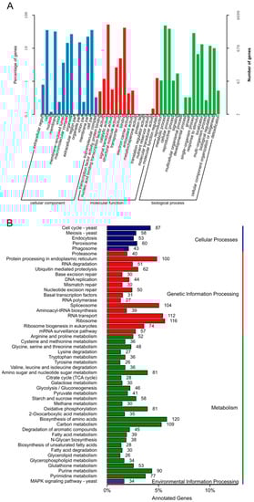 Gene ontology (GO) and Kyoto Encyclopedia of Genes and Genomes (KEGG) functional annotation of the Ganoderma lucidum yw-1-5 genome. GO functional enrichment (A) and KEGG pathway (B) enrichment of putative genes in yw-1-5.