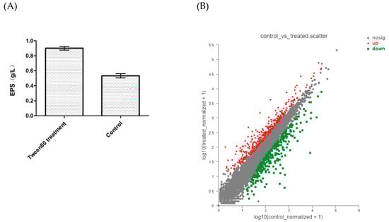 The content of exopolysaccharides (A) and the comparison of DEG expression between Tween80-treated group and control group (B).