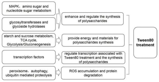 Submerged fermentation of mycelium is an effective approach to obtain G. lucidum exopolysaccharides, due to its shorter culture period and seasonal independence [6]. In particular, a polysaccharide isolated from submerged cultured G. lucidum, namely GLEP-2, presented enhanced effects on the lymphocyte proliferation [7]. However, according to our previous research, the total content of exopolysaccharides from submerged cultured G. lucidum normally ranged from 0.5 g/L to 1 g/L, indicating that content of G. lucidum exopolysaccharides cannot meet industrial requirements. Therefore, the improvement of exopolysaccharide production of G. lucidum is an important trend. Although many physical approaches such as controlling light [8] can improve exopolysaccharide production, the addition of chemical agents is a more appropriate strategy, due to their low cost and easy separation [9]. Recently, the non-ionic surfactant Tween80, namely polyoxyethylene glycol sorbitan monooleate, has been applied to increase the exopolysaccharide production of mushrooms (e.g., Lentinus edodes [10], Schizophyllum commune [11]) in submerged fermentation. Our previous work showed that the addition of Tween80 increased the production of G. lucidum strain yw-1 exopolysaccharide in submerged fermentation [12] Although Tween80 increased the expression level of key genes, which were involved in the synthesis of exopolysaccharides [12], the mechanism of the enhanced effect of Tween80 on exopolysaccharide production in G. lucidum remains unclear.