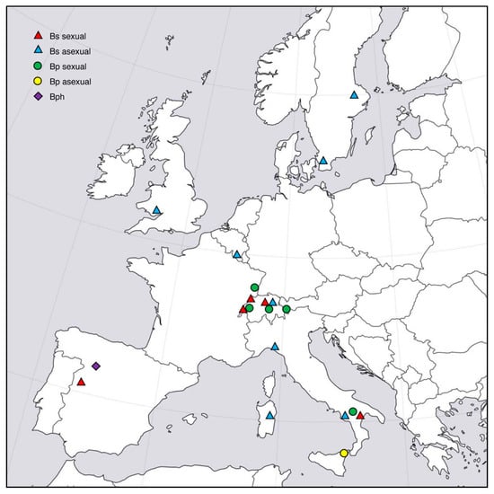 Location of collection sites in Europe of Epichloë-infected Brachypodium species: B. sylvaticum (Bs), B. pinnatum (Bp) and B. phoenicoides (Bph). Symbols distinguish between host, and stroma-forming (sexual) or symptomless (asexual) infections.