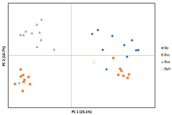 Principal coordinate analysis (PCoA) based on 16 microsatellite loci of Epichloë isolates from Brachypodium hosts: B. sylvaticum (Bss, sexual isolates; Bsa, asexual isolates), B. pinnatum (Bp) and B. phoenicoides (Bph).