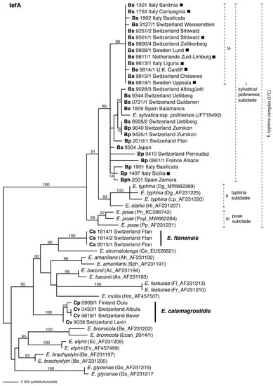 In the tefA phylogeny all isolates from Brachypodium hosts grouped in a moderately supported clade in the E. typhina complex (Figure 4). As in the tubB tree, Bs and Bp isolates were not resolved by host species in the tefA tree. A moderately supported subclade (Ia) of the tefA tree encompassed all asexual Bs isolates together with some of the sexual Bs isolates. Otherwise, the clade exhibited no resolution based on host or geography.
