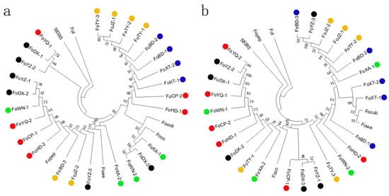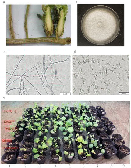 - Liu, X.; Xing, M.; Kong, C.; Fang, Z.; Yang, L.; Zhang, Y.; Wang, Y.; Ling, J.; Yang, Y.; Lv, H. Genetic Diversity, virulence, race profiling, and comparative genomic analysis of the Fusarium oxysporum f. sp. conglutinans strains infecting cabbages in China. Front. Microbiol. 2019, 10, 1373. [Google Scholar] [CrossRef]