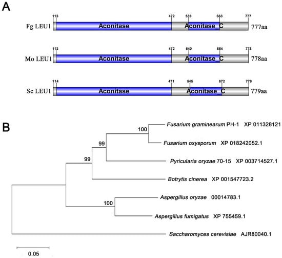 Sequence and phylogenetic analysis of LEU1. (A) Sequence and phylogenetic analysis of LEU1 in Fusarium graminearum (Fg), Magnaporthe oryzae (Mo), and Saccharomyces cerevisiae (Sc). Aconitase: An enzyme that catalyzes the stereo-specific isomerization of citrate to isocitrate via cis-aconitate in the tricarboxylic acid cycle through a non-redox-active process. Aconitase C: The Aconitase C-terminal domain, which undergoes conformational change in the enzyme mechanism. (B) A phylogenetic tree of LEU1 with homologues from other fungal species was constructed using the neighbor-joining method in MEGA version 7.0. Numbers at the nodes in the rooted tree represent the bootstrap value after 1000 replications. GenBank accession numbers are presented after the fungal species names. The bar indicates 0.05 distance units.