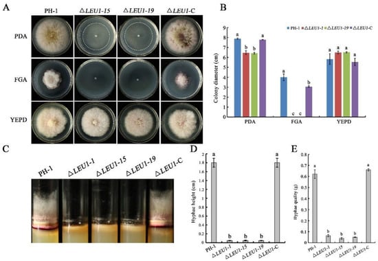 Hyphal growth of PH-1, ΔLEU1, and ΔLEU1-C strains. (A) Colonies of the wild type (PH-1), FgLEU1 deletion mutants, and complemented strains were cultured on PDA, FGA, and YEPD agar plates after 4 days at 25 °C. (B) Height of aerial mycelium in test tubes containing PDA medium after 4 days at 25 °C. (C) Colony diameters of strains cultured on PDA, FGA, and YEPD plates. (D) Colony height of strains cultured in tubes with PDA. (E) Hyphal quality of strains cultured in potato dextrose broth (PDB) at 25 °C for 5 days at 180 rpm. Different letters on the bars for each treatment indicate significant differences at p < 0.05 by Duncan’s multiple range test. Measurements represent the average of three independent experiments. All experiments were repeated three times with three replicates at each time.