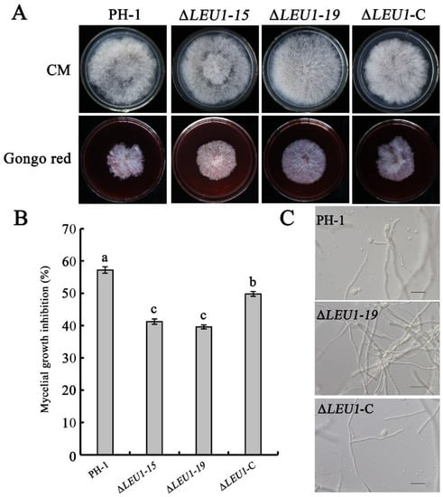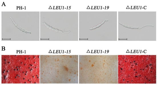 F. graminearum PH-1 was used as the wild-type (WT) strain for constructing the mutants (ΔLEU1) and complementary (ΔLEU1-C) strains. All the strains were cultured at 25 °C on potato dextrose agar medium (PDA), complete medium (CM), fructose gelatin agar (FGA), or yeast extract peptone dextrose (YEPD). For mycelial growth assays, all strains were grown at 25 °C on PDA medium and CM medium for 4 days. The colony diameter was measured using the crossed wire method. The average of the data obtained was processed. For the aerial hyphal growth assay, 5 mL of sterilized PDA medium was added to the test tube (1.5 cm in diameter). All strains were inoculated and grown for 5 days at 25 °C in test tubes. Hyphal quality was measured by filtration collection of solid materials after culture for 5 d in PDB, rinsed with sterilized water, dried in an oven at 65 °C, followed by determination of mycelial dry weight. All experiments were repeated three times. To induce asexual reproduction, mycelia were shaken in liquid carboxymethyl cellulose (CMC) medium at 180 rpm. Fungal mycelia were harvested from potato dextrose broth (PDB) and used for extracting total genomic DNA and RNA. Escherichia coli DH5a was used for normal bacterial transformation and was cultured at 37 °C. To test cell wall integrity, the colony diameter was measured using a CM plate with 0.4 mg/mL Congo Red (CR) added. Exogenous amino acids were added to the FGA at different concentrations, as indicated in the figures. Five 5 mm mycelial plugs of the wild-type strain and mutants were collected from the edge of a 3-day-old colony and incubated in the plates. Carrot agar was used to assess sexual reproduction. The experiments were repeated three times, with three replicates each.