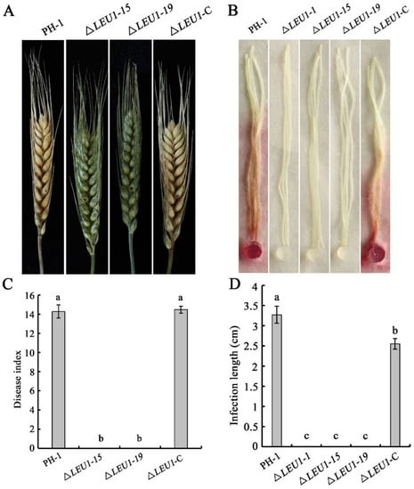To determine the role of FgLEU1 in pathogenicity, pathogenicity assays were conducted to determine the effect of ∆LEU1 on flowering wheat heads and corn silks. On wheat heads inoculated with 4.0 × 105 conidia/mL either PH-1 or ΔLEU1-C, typical scab symptoms spread from the inoculated to uninoculated spikelets within 14 days post inoculation (dpi). To our surprise, the mutant strain was completely unable to infect the spikelet, and the disease index score was 0 (Figure 4A,C). This was also confirmed by the results of corn silk infection assays; PH-1 and ΔLEU1-C could form typical brown lesions at 5 dpi, but the mutants could not (Figure 4B,D). These results indicate that FgLEU1 plays an important role in pathogenicity.