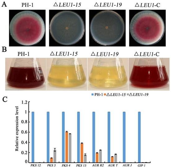 Pigment production and relative expression level of aurofusarin biosynthesis genes by the wild-type strain PH-1 and FgLEU1 deletion mutants. (A) Red pigment aurofusarin formation by the wild-type PH-1, FgLEU1 deletion mutants, and complementation strains cultured on PDA at 25 °C for 4 days. (B) Red pigment aurofusarin formation by the wild-type PH-1, FgLEU1 deletion mutants, and complementation strains cultured in liquid medium in flasks containing 50 mL of PDB at 180 rpm, 25 °C for 5 days. (C) Relative expression levels of aurofusarin biosynthesis-related genes. GAPDH was used as an internal control. Gene expression in PH-1 was set to 1.0 (p < 0.05).