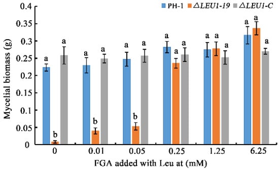 As shown in Figure 2, FgLEU1 deletion resulted in amino acid auxotrophy in F. graminearum. ∆LEU1 could not survive normally on PDA, a semi-synthetic medium. It could not survive in the absence of amino acids on FGA. In contrast, the auxotrophy of ΔLEU1 could be completely recovered when cultured on the full-nutrition medium, YEPD. Therefore, we examined whether the growth defects caused by nutrient deficiency could be repaired by exogenous leucine added to fructose gelatin broth (FGB) medium. The results of mycelial biomass analysis showed that the nutritional deficiency of mutants could be partially recovered by exogenous leucine addition. When the terminal leucine concentration was greater than 0.25 mM, the growth defects of the mutants were almost completely eliminated (Figure 6).
