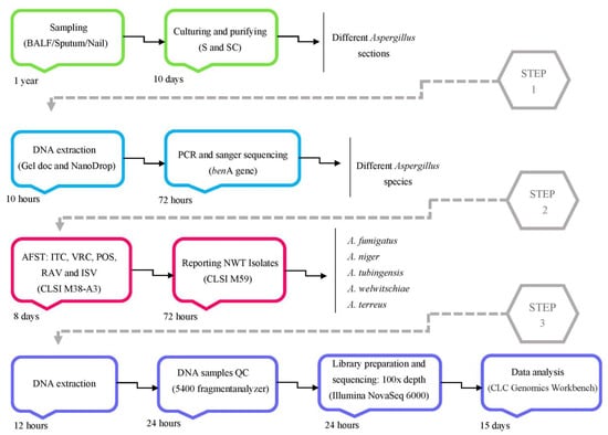 The steps of project implementation, from sample collection to WGS. The estimated time to complete each of the key stages of the project indicates that after the sampling phase, which spans a period of one year, within two months, it is possible to analyze azole-resistant Aspergillus spp. through whole genome sequencing to identify all SNPs in the entire genomic content.