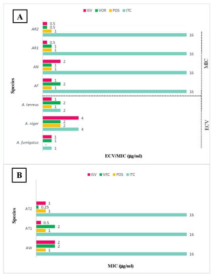 (A) The distribution of minimum inhibitory concentrations (MICs) of different Aspergillus isolates against tested triazoles compared to epidemilogical Cutoff values (ECVs). (B) The MICs of different Aspergillus isolates without defined ECV against tested triazoles.