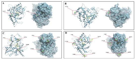 Homology modeling of CYP51A of the selected Aspergillus species and mutation mapping on the structures. Each structure was shown in two different presentations. (A) (A. terreus), (B) (A. tubingensis), (C) (A. niger) (D) (A. fumigatus).