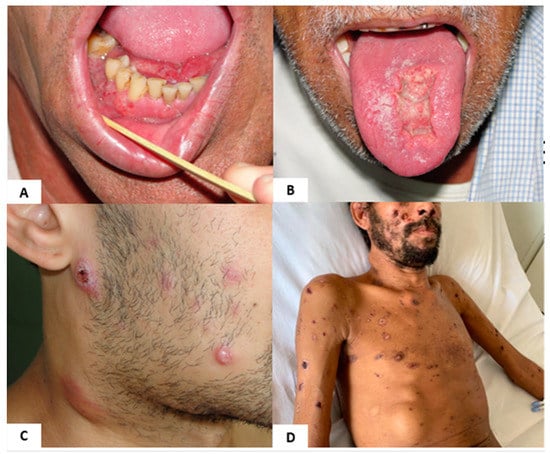 (A) Chronic form: gingival and lingual frenulus “mulberry-like” ulcers with hemorrhagic dots; (B) chronic form: deep ulcerative lesion on the tongue with infiltrative borders, hemorrhagic dots, covered with fibrin; (C) acute/subacute form: multiple polymorphic (nodular, papular, and ulcerated) skin lesions and cervical inflammatory lymphadenopathy; (D) disseminated form in a patient with PCM and HIV co-infection; the following may be seen: cervical lymphadenopathy, exuberant ulcerated, crusted skin lesions, and larges subcutaneous abscesses in the thorax and abdomen.
