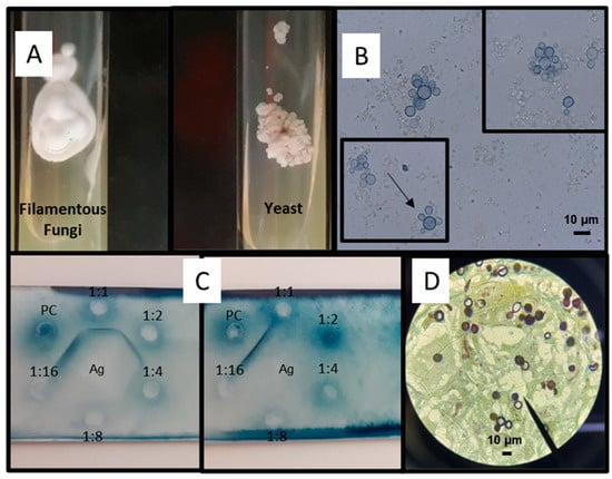 Laboratory diagnosis of Paracoccidioidomycosis. (A) Paracoccidioides spp. on Sabouraud agar slants for 14 days at 25 °C (left, filamentous phase) and 37 °C (right, yeast phase); (B) yeast form showing multiple budding (5 to 15 µm) seen upon direct examination of a lymph node aspirate, stained with KOH and Parker ink; Bars 10 µm (C) double immunodiffusion assay: Paracoccidioides brasiliensis exoantigen (Ag) is in the center well; sera sample from a patient with paracoccidioidomycosis is used in different titrations (wells 1:1 to 1:16) and positive control (PC); positive 1:2 (left) and negative (right); (D) Grocott’s methenamine silver stain showing Paracoccidioides yeast cells. Bars 10 µm.