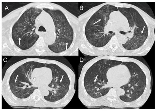 Computed tomography showing ground-glass opacities (arrows) with bilateral and symmetric distribution, occurring mainly in the periphery and the middle-third of the lungs (“butterfly wing” pattern), as shown from top to bottom in (A–D).