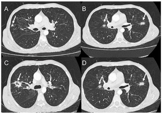 Computed tomography showing nodular opacities bilaterally distributed (arrows in A–D), with cavitation (arrow in C), as shown from top to bottom in figures (A–D).