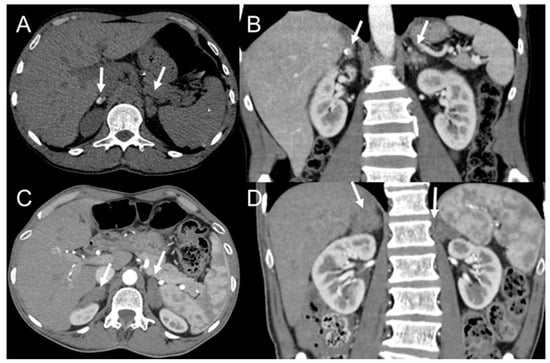 The abdomen is less frequently affected than the chest. Abdominal involvement is mainly observed in patients with the acute form of PCM, which may primarily involve the adrenal glands, liver, spleen, lymph nodes, and intestinal loops. The adrenal gland is the most commonly affected abdominal organ. There may be diffuse enlargements of the gland with heterogeneous attenuation on CT and MRI, with peripheral contrast enhancement in the acute form of the disease. Adrenal atrophy and calcification are usually observed during the chronic phase (Figure 6). Differential diagnoses should include other granulomatous infections, such as histoplasmosis and tuberculosis; old hemorrhage; and neoplasms, such as lymphoma, primary tumors, and metastases [131].