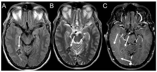 Magnetic resonance imaging showing a hypointense lesion on fluid-attenuated inversion recovery (FLAIR) (A) and T2-weighted imaging (T2WI) (B), with an annular enhancement on T1 post-contrast (C) located in the right occipital and temporal lobes.