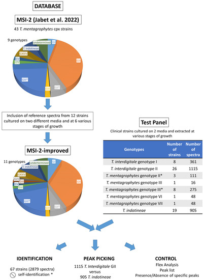 Therefore, in this study, we established new references and assessed the ability of the resulting new spectra library (available at https://msi.happy-dev.fr/, accessed on October 2022) to distinguish T. indotineae, regardless of the culture medium or the time of growth, from other species of the T. mentagrophytes complex, especially genotypes that are the most frequently occurring in France and Europe, i.e., genotypes I, II, II*, III*, VI and VII [5].
